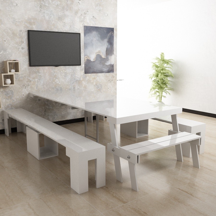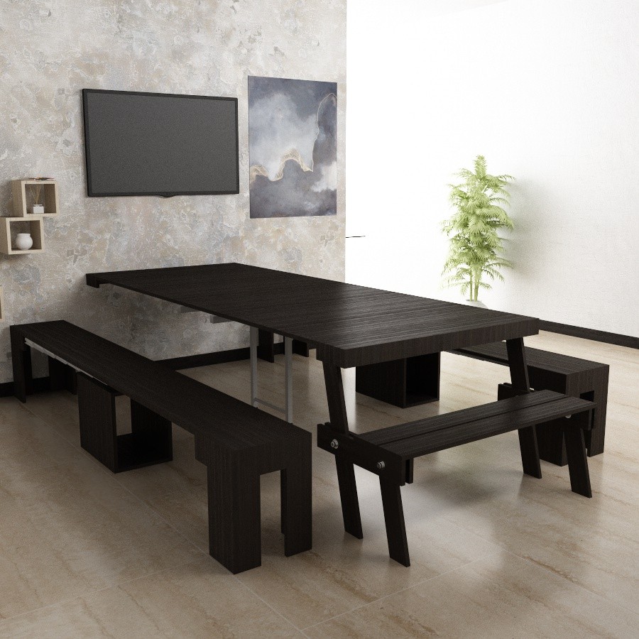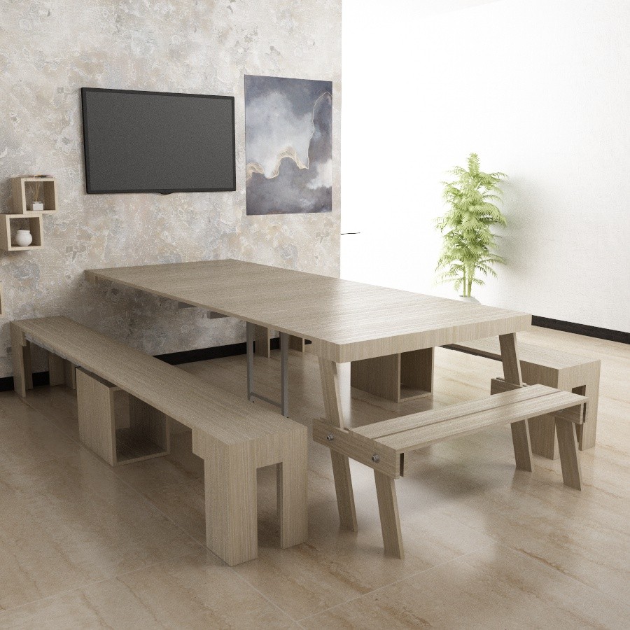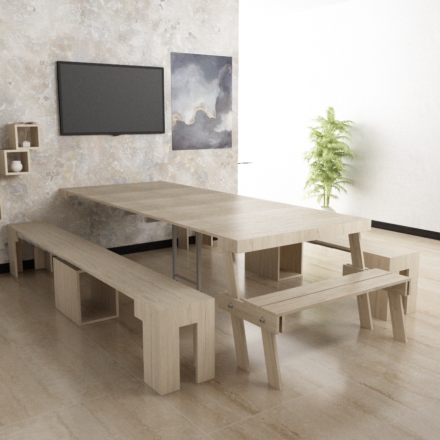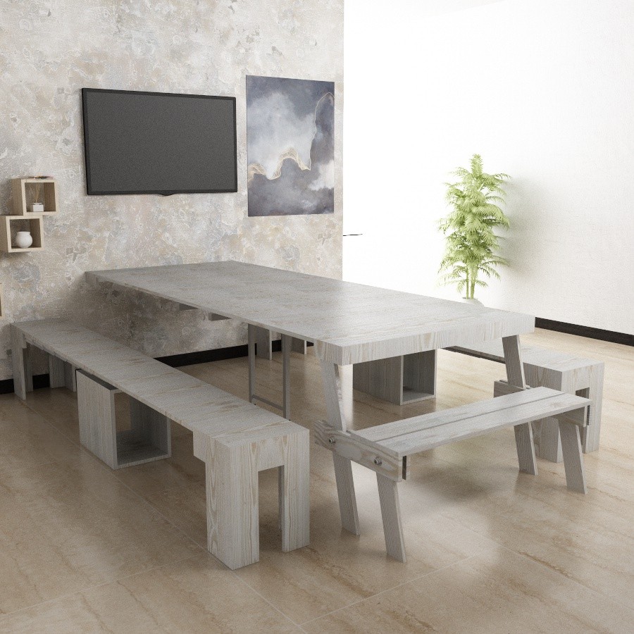 La console Nik est pratique et robuste, et à partir d’une petite table d’ameublement, elle devient rapidement une table de cuisine, avec des longueurs variables jusqu’à 300 cm. Avec la table, ils sont fournis aussi le pied porte rallonges en bois et les rallonges 52x120 cm et le pied central en acier.